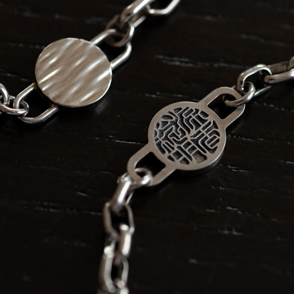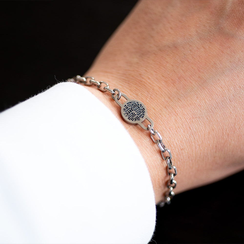 2人の名前を1つに結んだ「しるし結び」を刻んで作るペアブレスレット。「水面」のように、パートナー同士の想いをしっかりとふたりの間に”映し出せる関係”となることを願って。※汗や水に強く鯖にくいチタン素材を使用